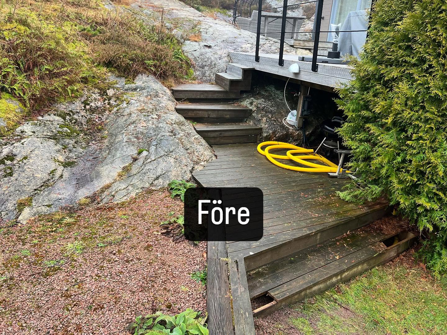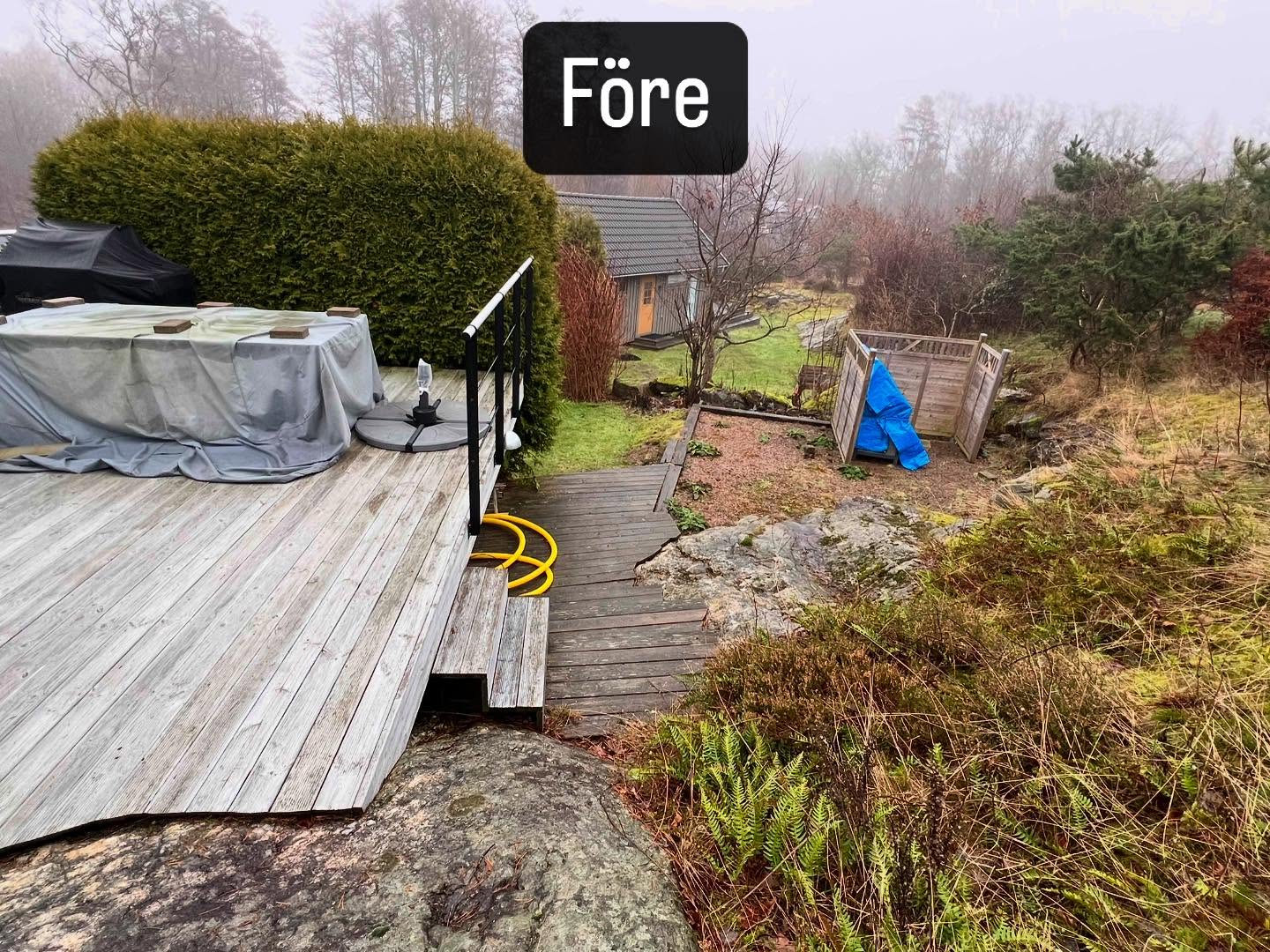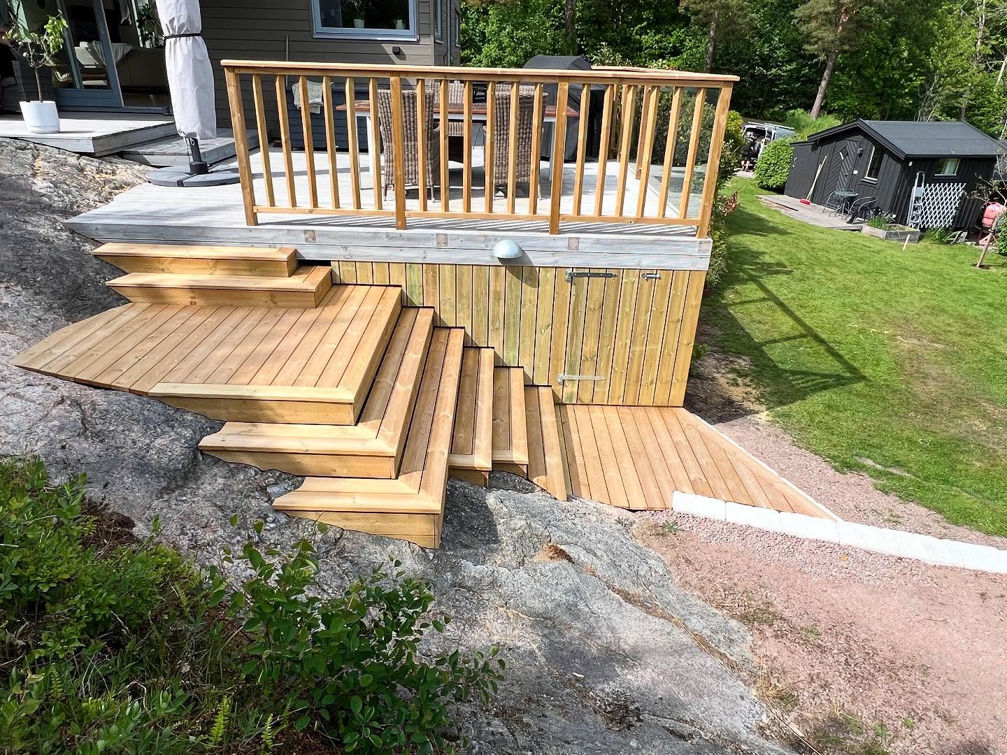Befintlig altan som fått sig en uppgradering i form utav nya räcken, glaspartier, trappor, stenläggning och nedklädnad med lucka