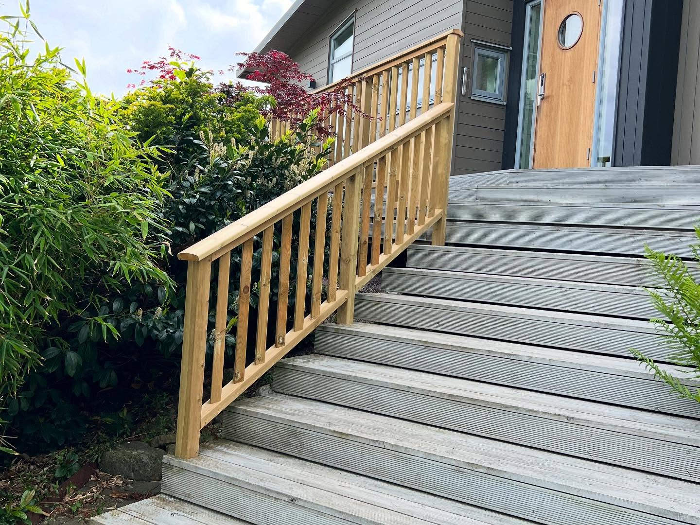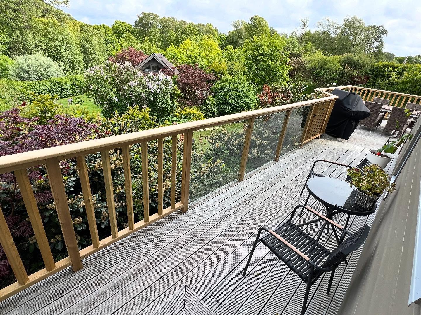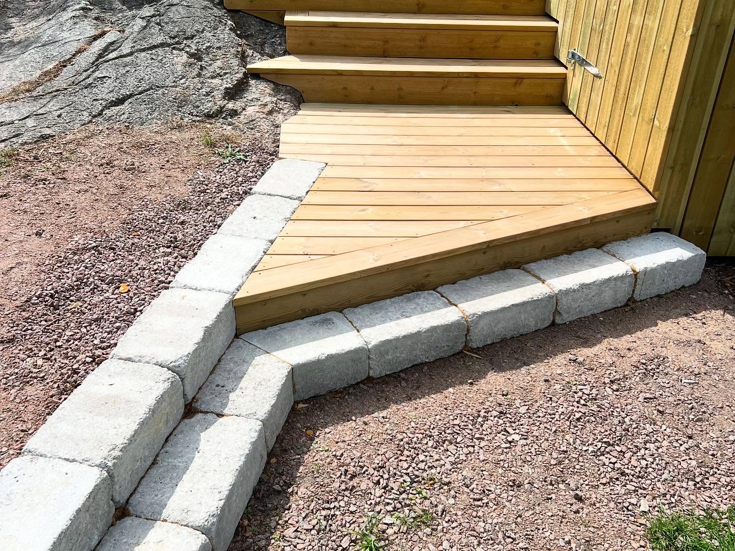 Befintlig altan som fått sig en uppgradering i form utav nya räcken, glaspartier, trappor, stenläggning och nedklädnad med lucka