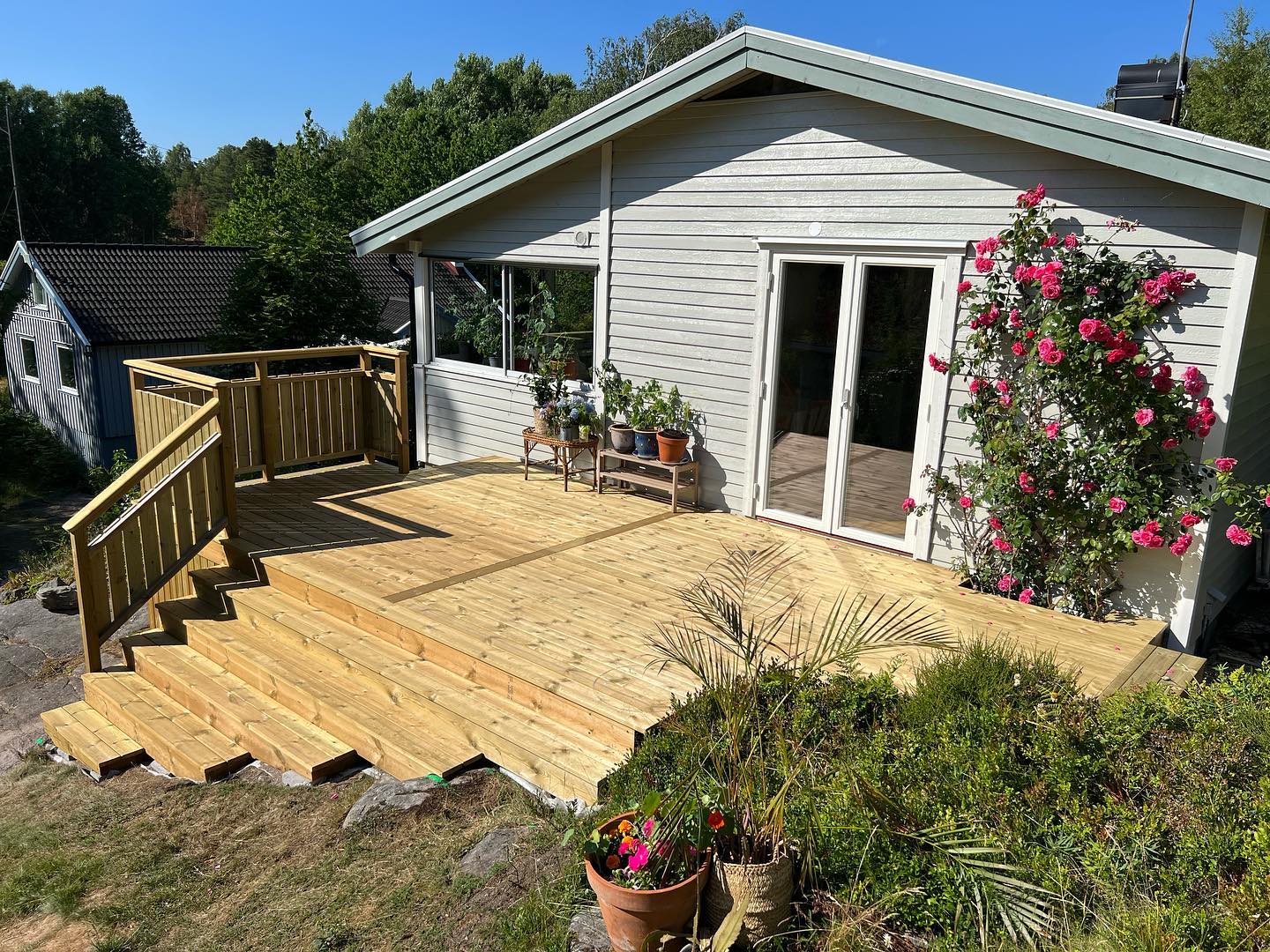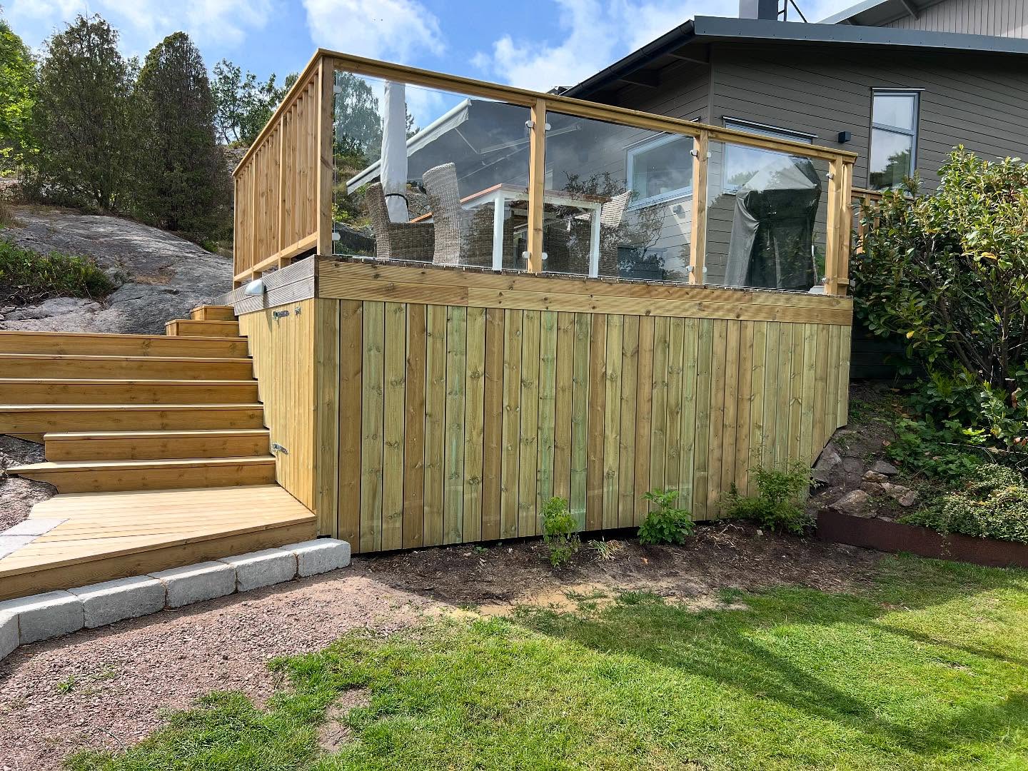 Befintlig altan som fått sig en uppgradering i form utav nya räcken, glaspartier, trappor, stenläggning och nedklädnad med lucka